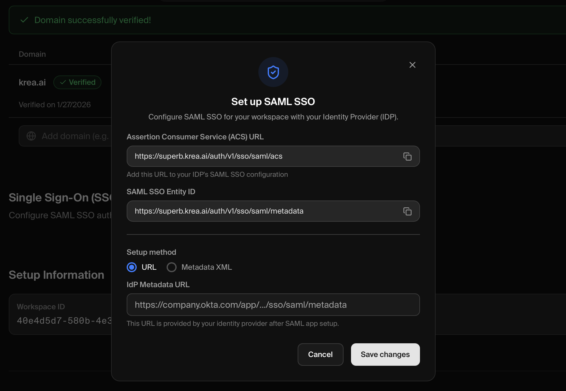 | Metadata XML | https://superb.krea.ai/auth/v1/sso/saml/metadata |